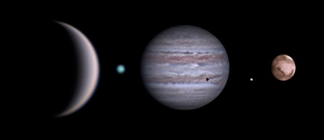 ![]() Venus, Mars, Saturn - im gleichen Maßstab festgehalten am 15.5.2012.Die starke Luftunruhe macht sich bemerkbar. |